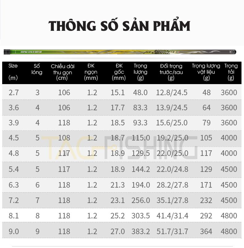 Lực phân bổ của cây cần là 19i, chất liệu carbon toray nhập khẩu 46T +40T đã giúp thân cần dẻo dai chắc khỏe cho độ cong hoàn hảo, kiểm soát cá ổn định và đàn hồi vượt trội.Thiết kế cần trọng lượng nhẹ, size 4m5 chỉ nặng 111,7g. Tay cầm chống trượt với nước sơn cao cấp chống mài mòn, trơn trượt, ưa nhìn với tông màu chủ đạo là màu xanh lá tạo cho cần thủ sự thoải mái khi sử dụng.Cần phù hợp đánh cá tổng hợp, chấp nhận thách thức với cả cá nhỏ và cá lớn.