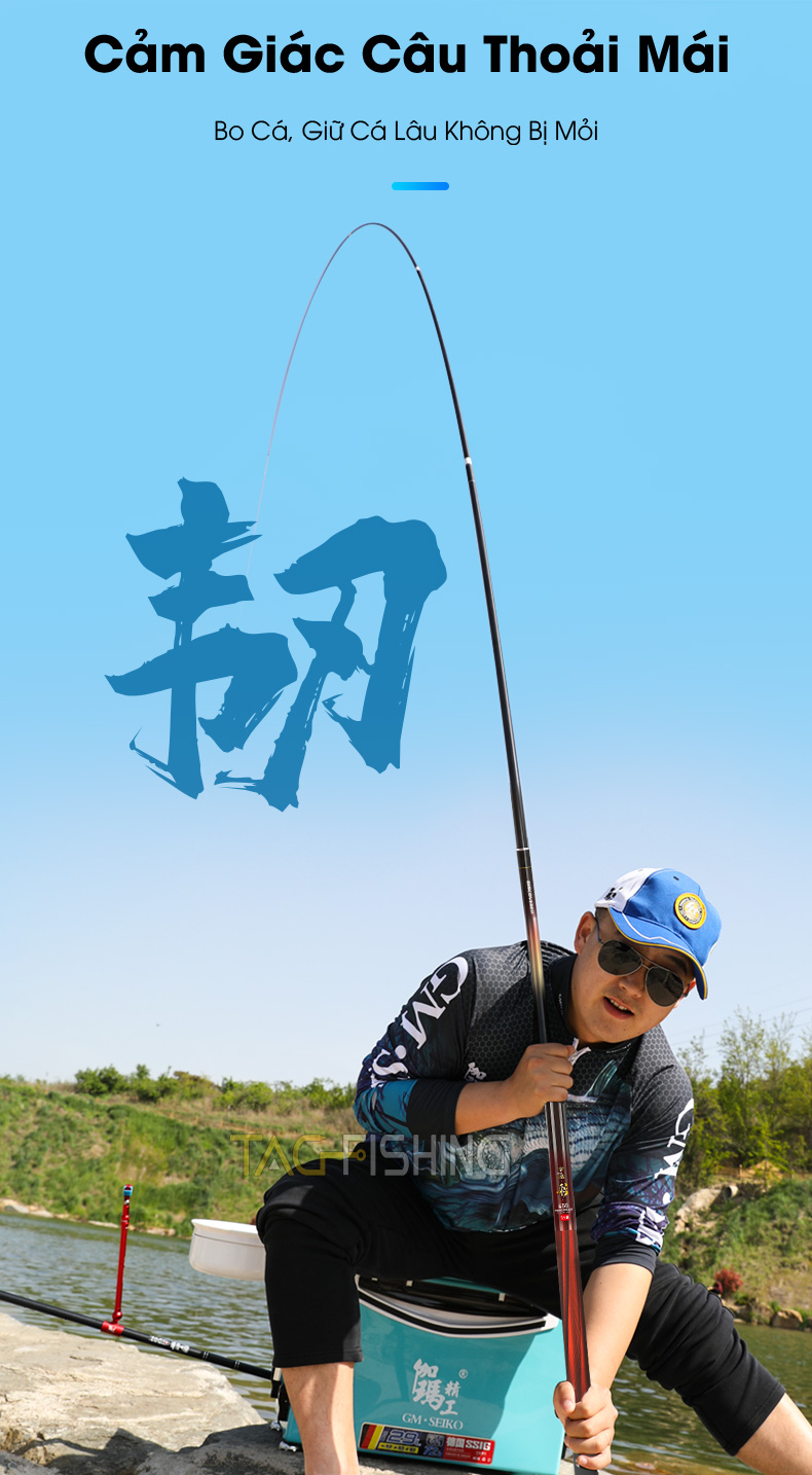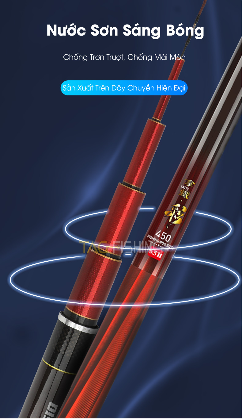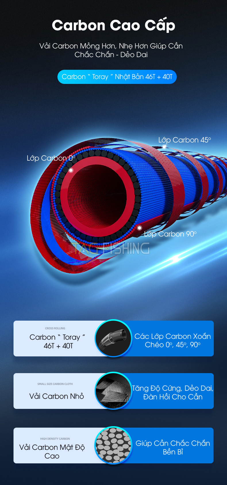 - Được làm từ vật liệu carbon Toray 40T - 46T cao cấp của Nhật Bản mang lại độ nảy tốt cho cây cần.
