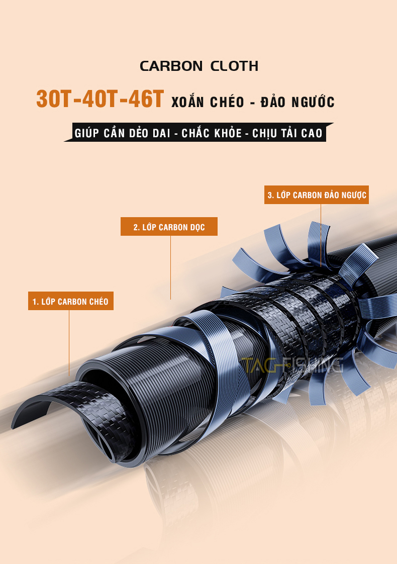 - Được làm từ vật liệu carbon Toray 30T - 40T - 46T cao cấp của Nhật Bản mang lại độ nảy tốt cho cây cần.