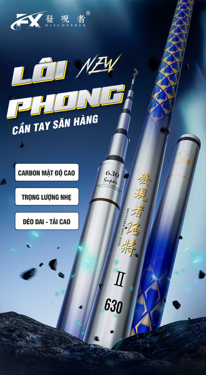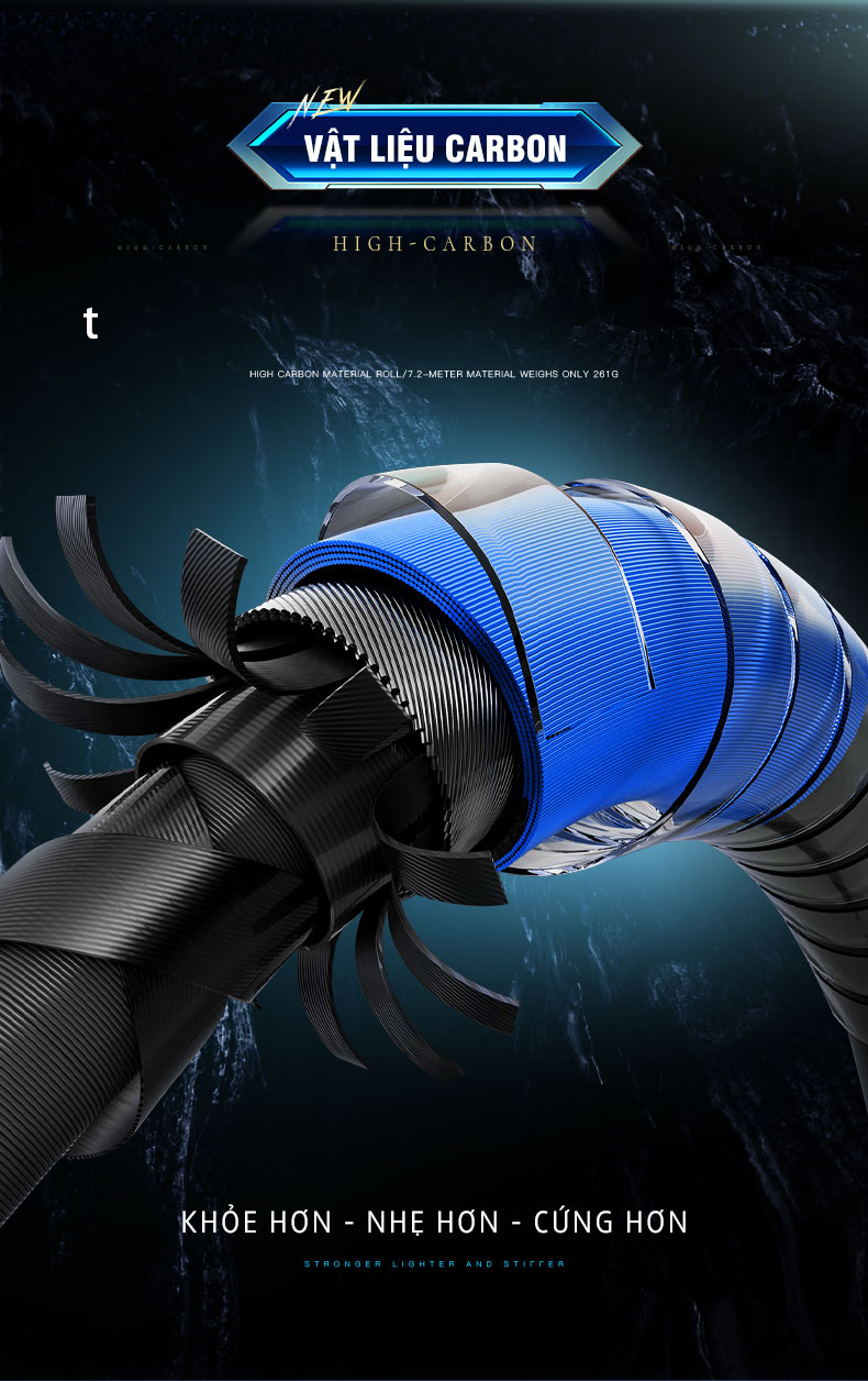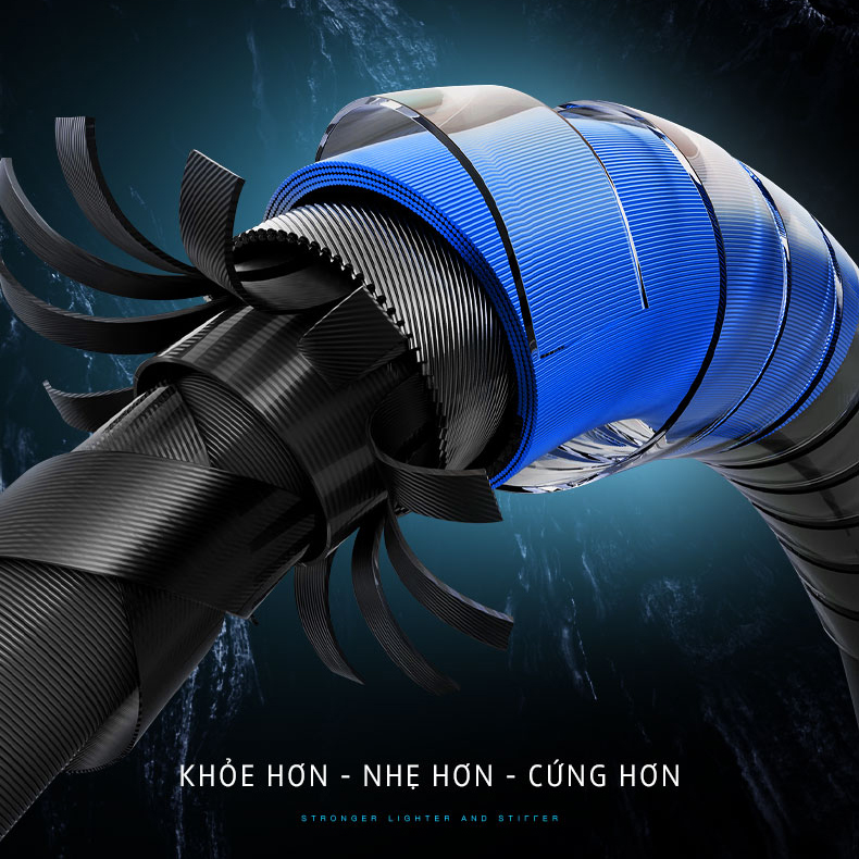 - Được làm từ vật liệu carbon mật độ cao xoắn chéo giúp trọng lượng cần nhẹ nhưng vẫn chắc khỏe và dẻo dai