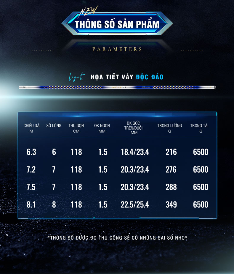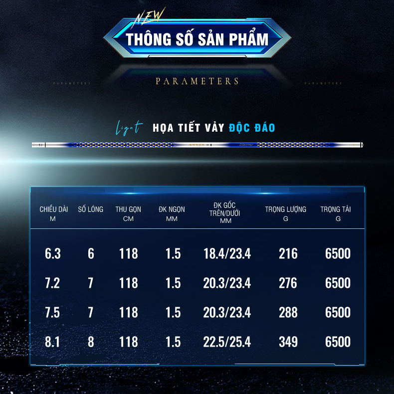 - Với trọng lượng siêu nhẹ chỉ 216gr cho size cần 6m3