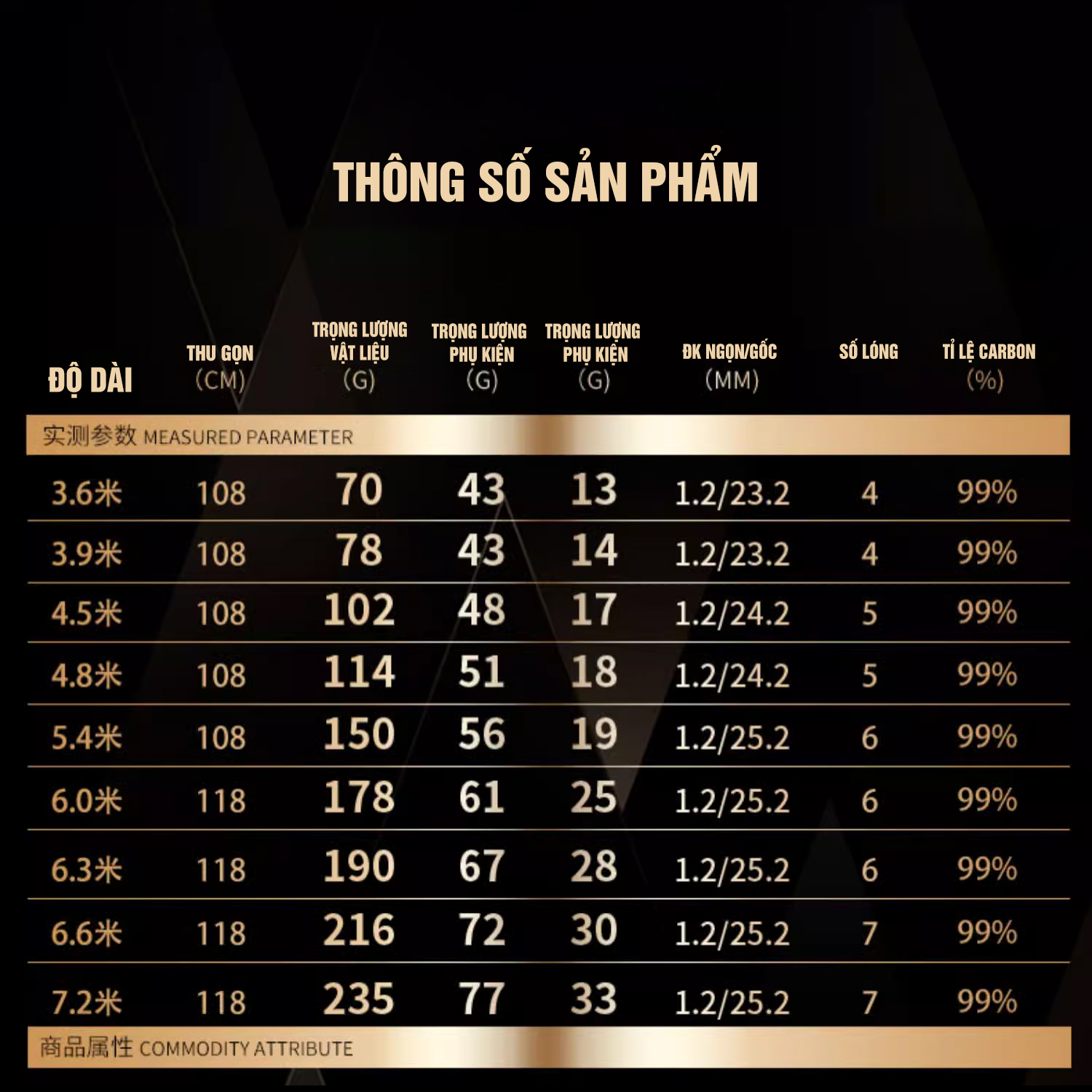 - Được làm từ vật liệu carbon Toray 60T cao cấp của Nhật Bản mang lại độ nảy tốt cho cây cần.