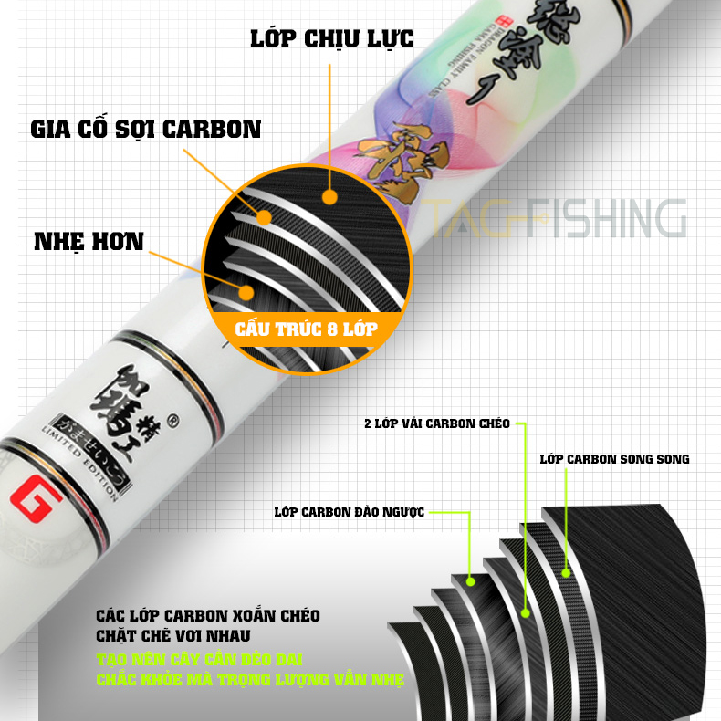 8 Lớp Carbon xoắn chéo + lớp carbon tổ ong tăng 12% độ dẻo dai và chắc khỏe cho cây cần mà trọng lượng không thay đổi |