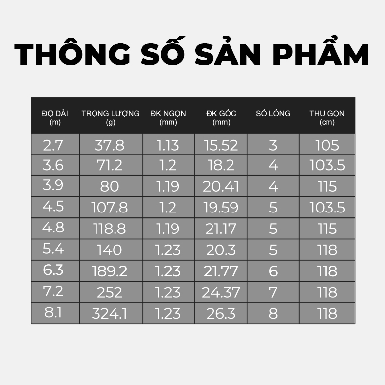 - Với trọng lượng nhẹ chỉ 71.2gr cho size cần 3m6