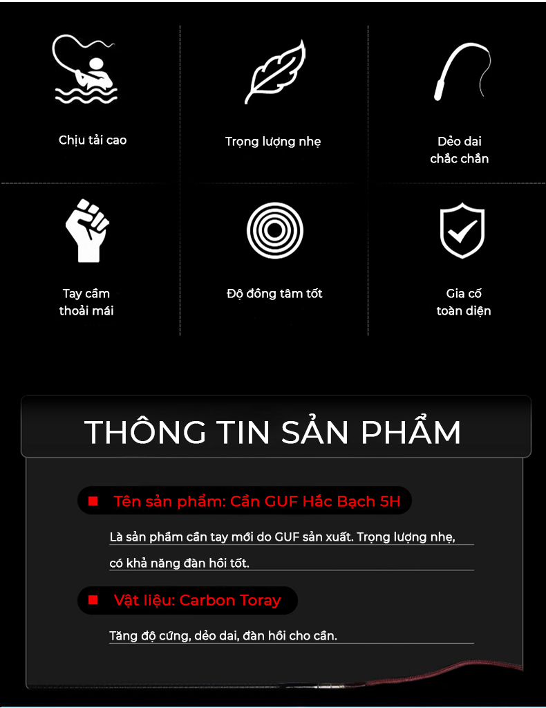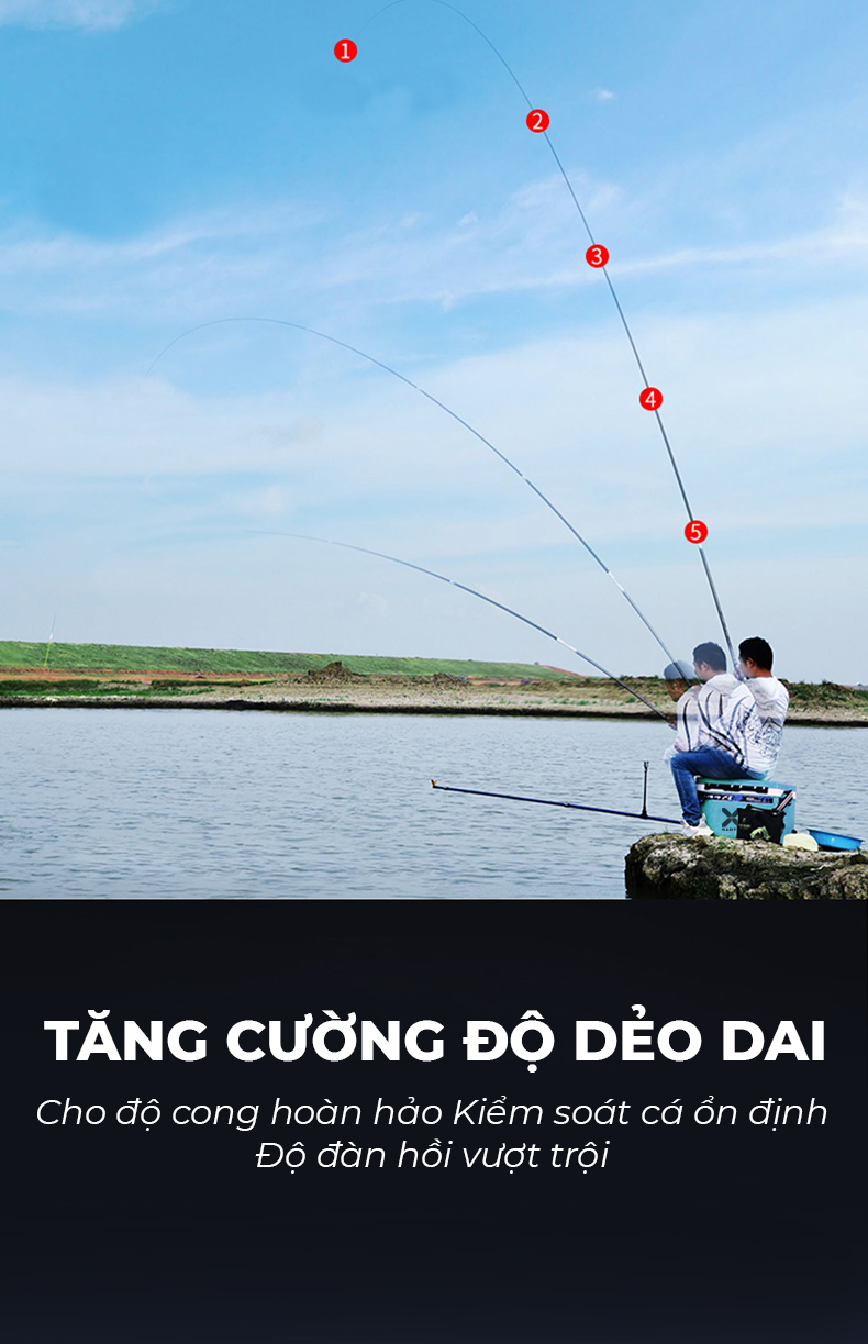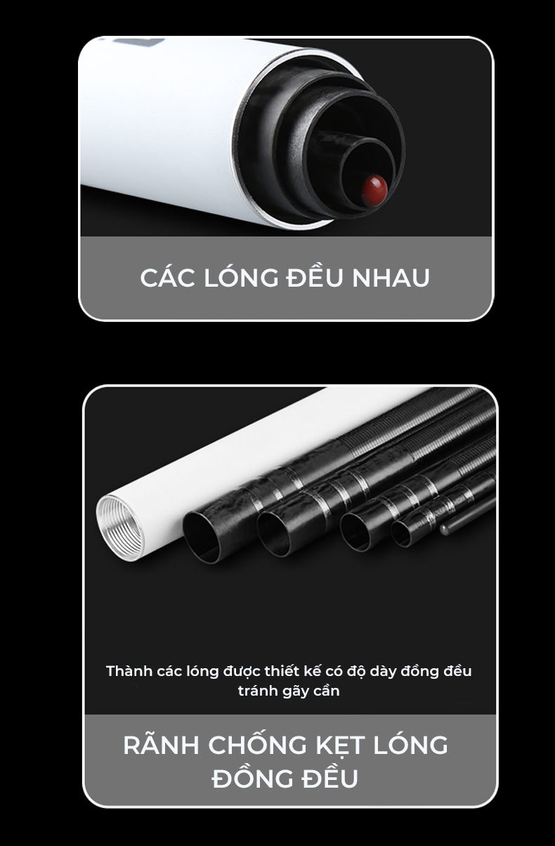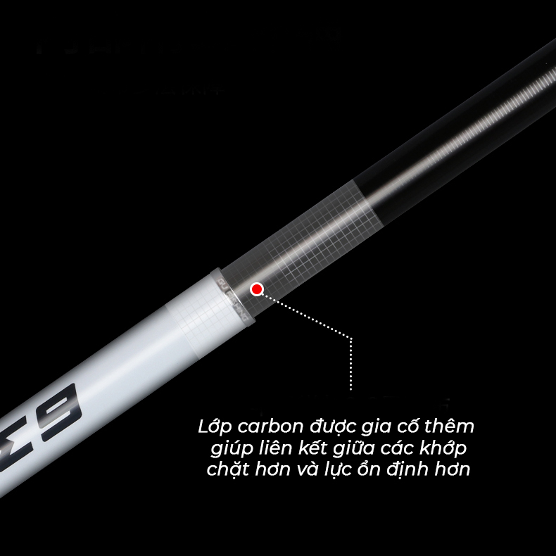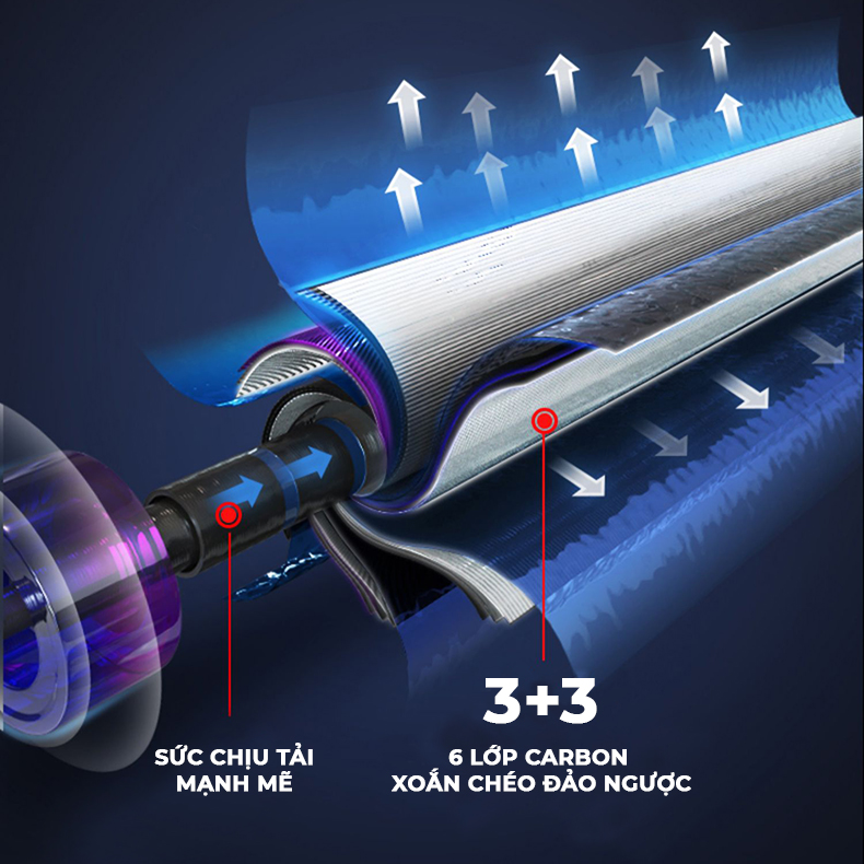 - Được làm từ vật liệu carbon cao cấp xoắn chéo 6 lớp giúp cần khỏe, độ nảy cao và trọng lượng nhẹ