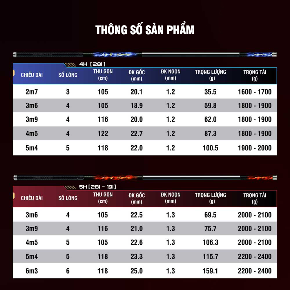 - Với trọng lượng nhẹ chỉ 100gr cho size cần 5m4 bản 4H