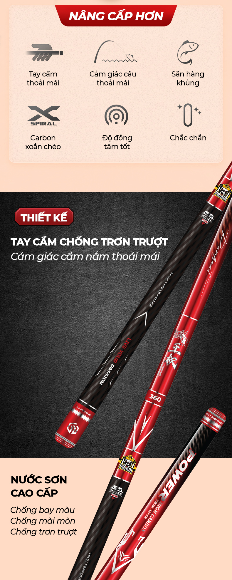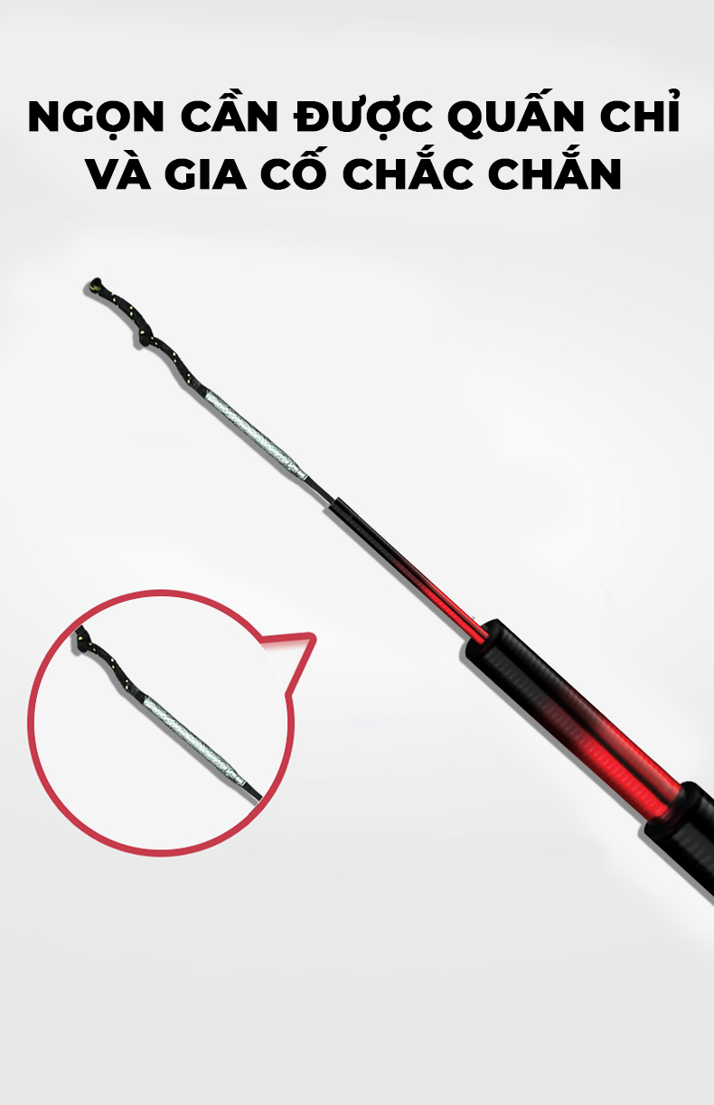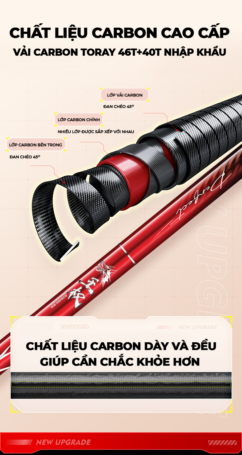 - Được làm từ vật liệu carbon cao cấp xoắn chéo 8 lớp giúp cần khỏe, độ chịu tải cao và trọng lượng nhẹ