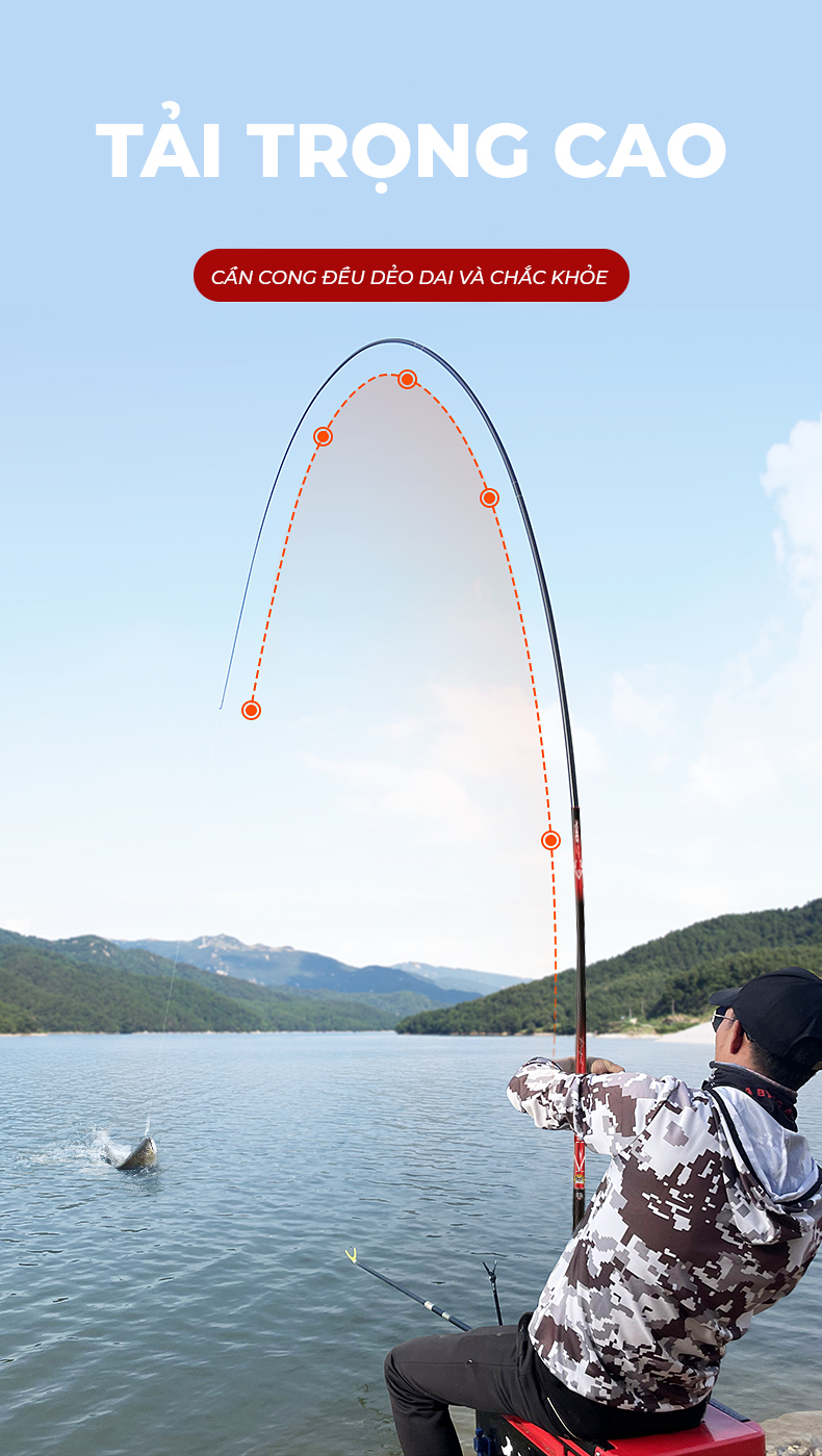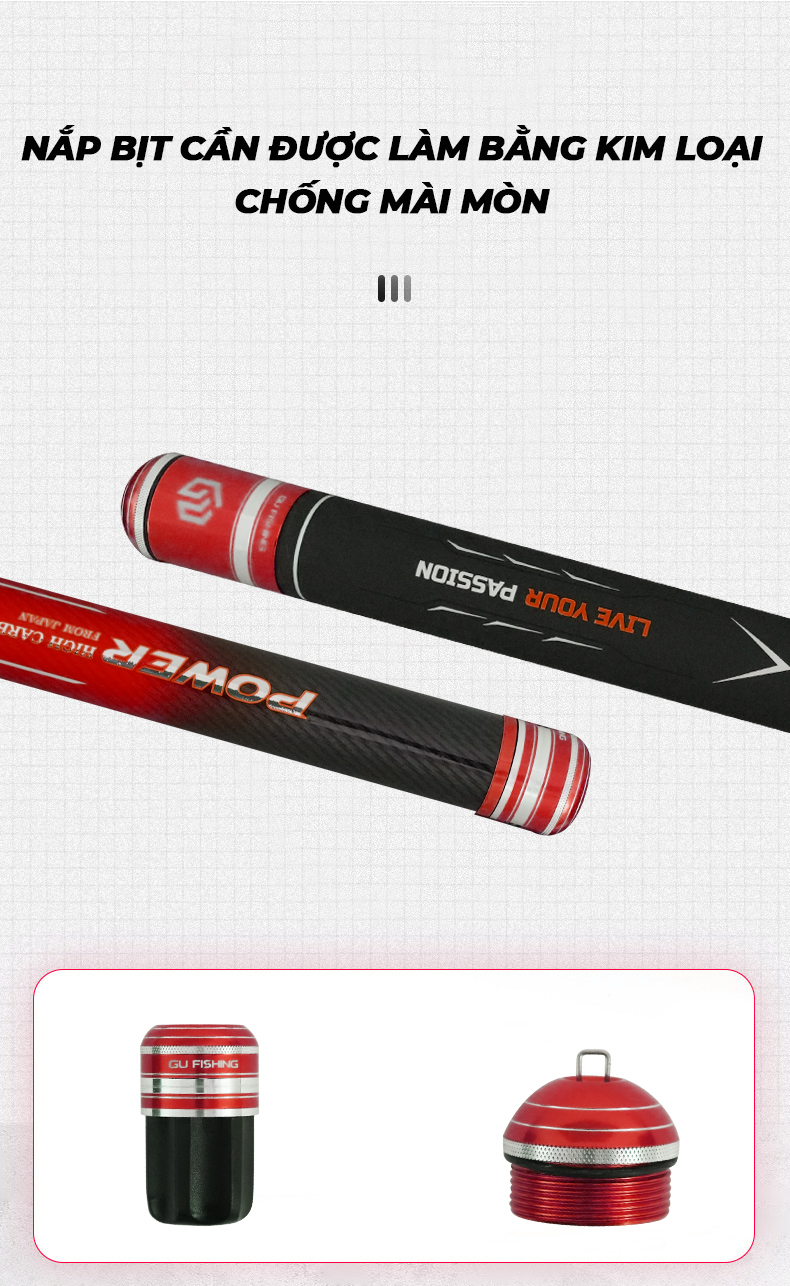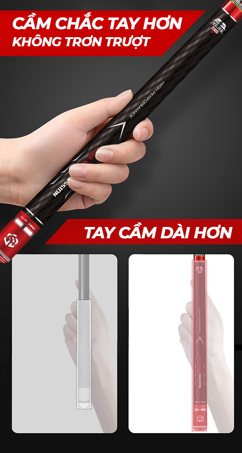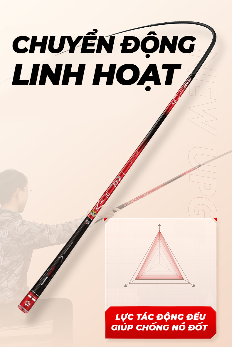 - Được làm từ vật liệu carbon cao cấp xoắn chéo 8 lớp giúp cần khỏe, độ chịu tải cao và trọng lượng nhẹ