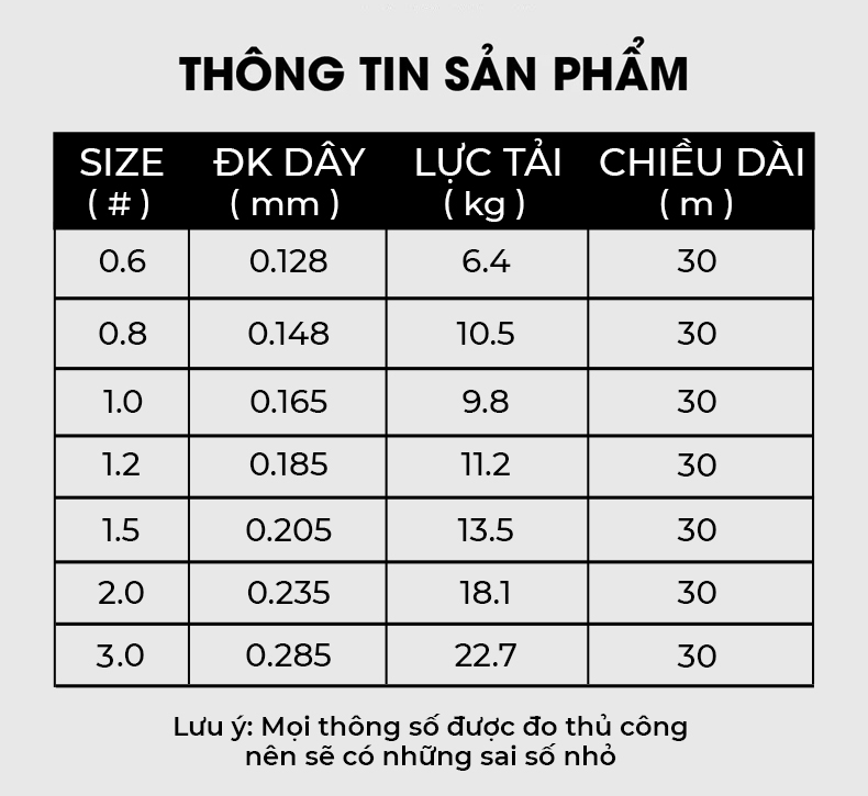 Kích cỡ: 0.8; 1.0; 1.2; 1.5; 2.0; 3.0