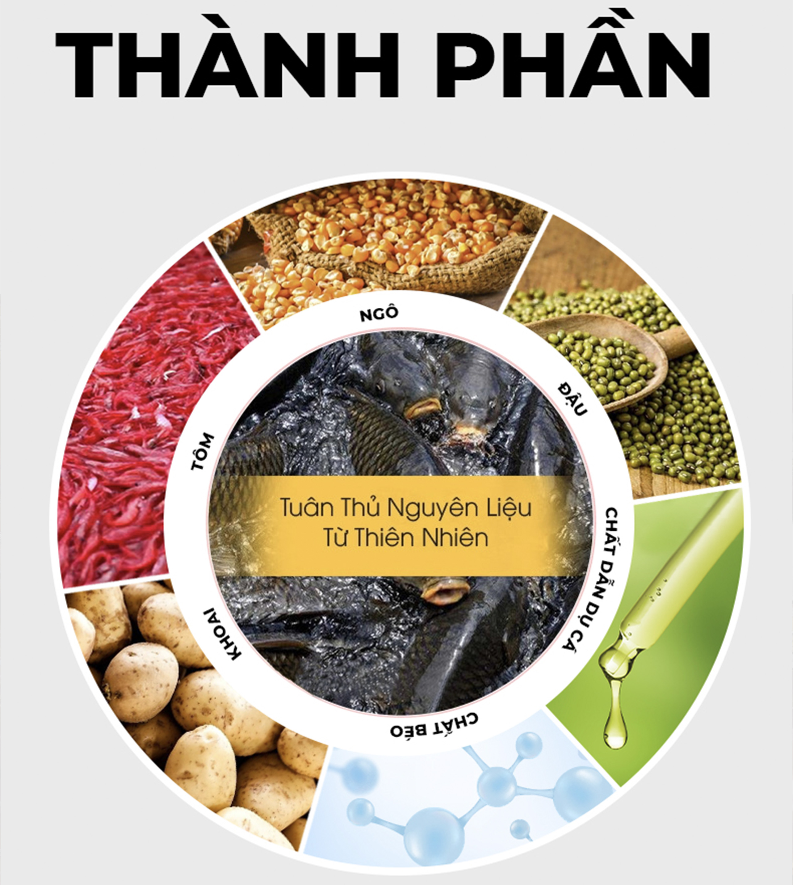 Sản phẩm được chế tạo từ các thành phần tự nhiên như Protein, Bột Tôm, Ngũ Cốc và chất dẫn dụ, không gây hại cho môi trường.