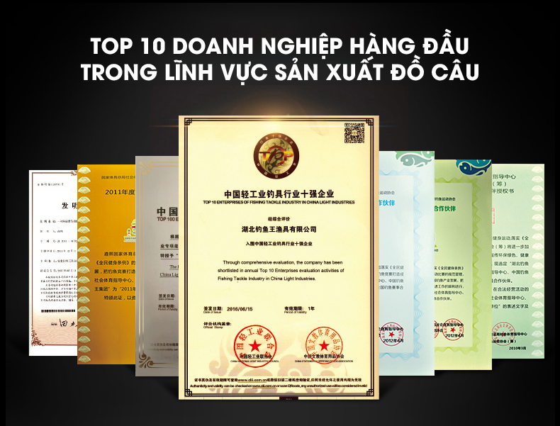 - Năm 2016: nằm trong TOP 10 doanh nghiệp xuất sắc ngành ngư cụ công nghiệp nhẹ của Trung Quốc