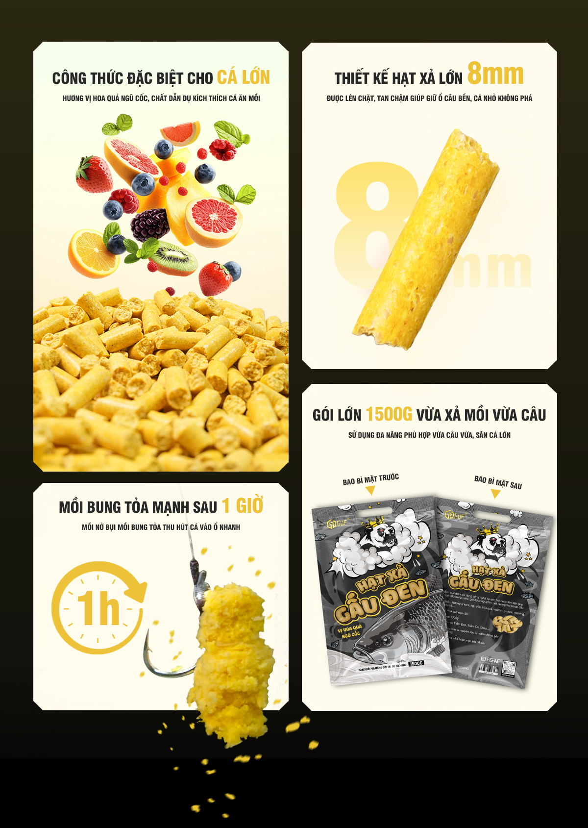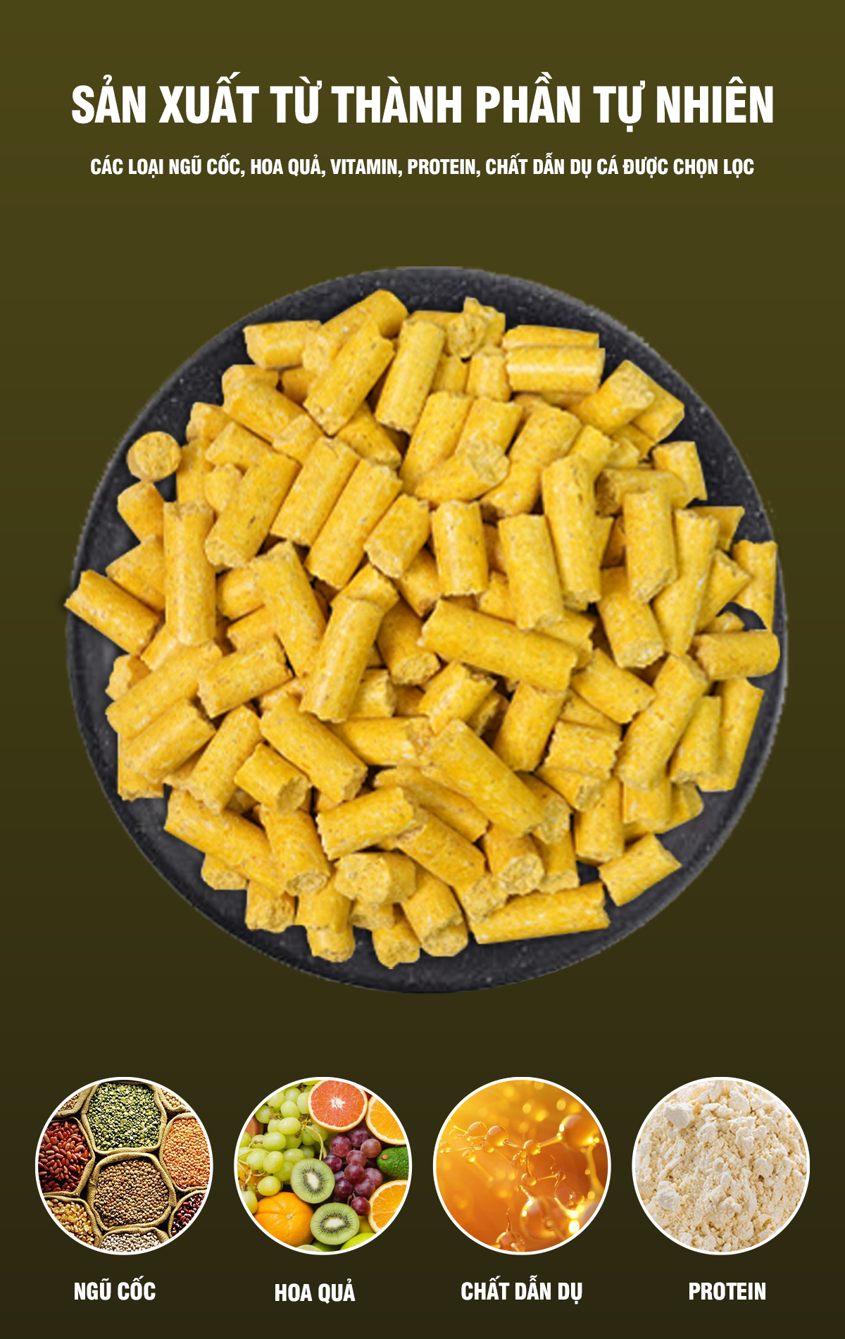 | Thành phần | Hương vị kem, ngũ cốc, hoa quả, protein, vitamin, mật ong, chất dẫn dụ cá,... |
