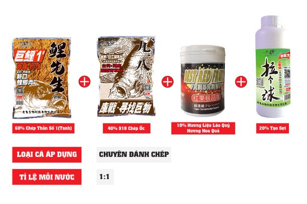 - 60% Chiến Thần Số 1 – Vị Tanh + 40% 918 Chép Ốc + 10% Hương Liệu Lão Quỷ Hương Hoa Quả + 20% Tạo Sợi