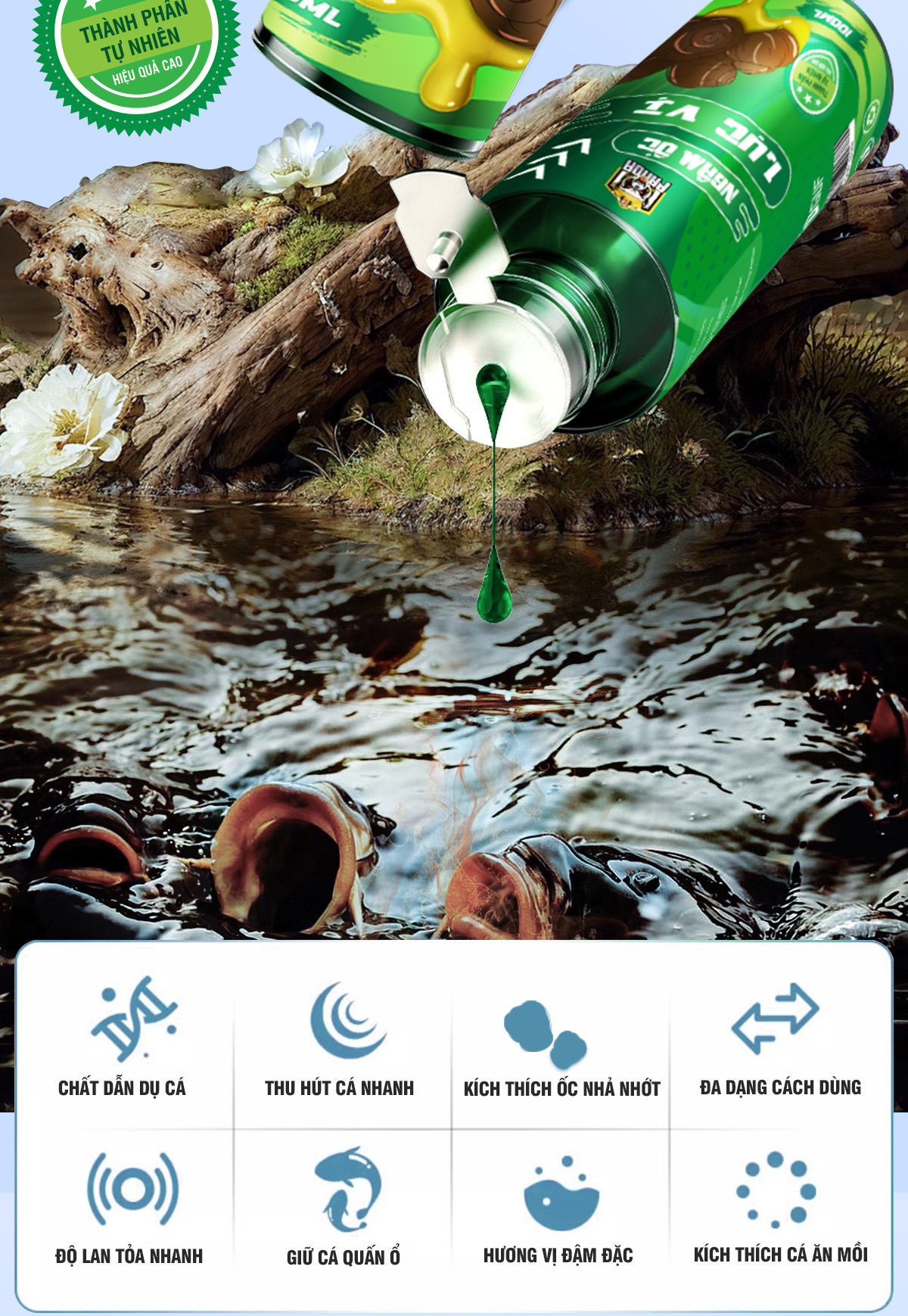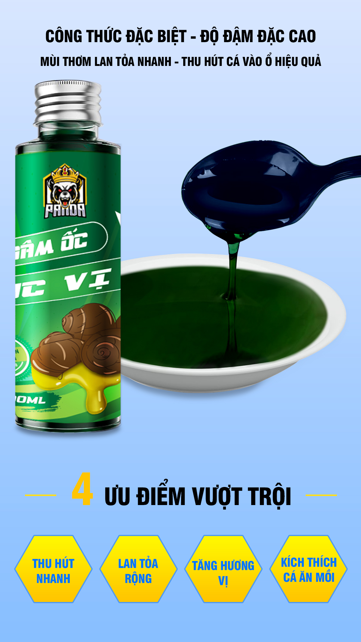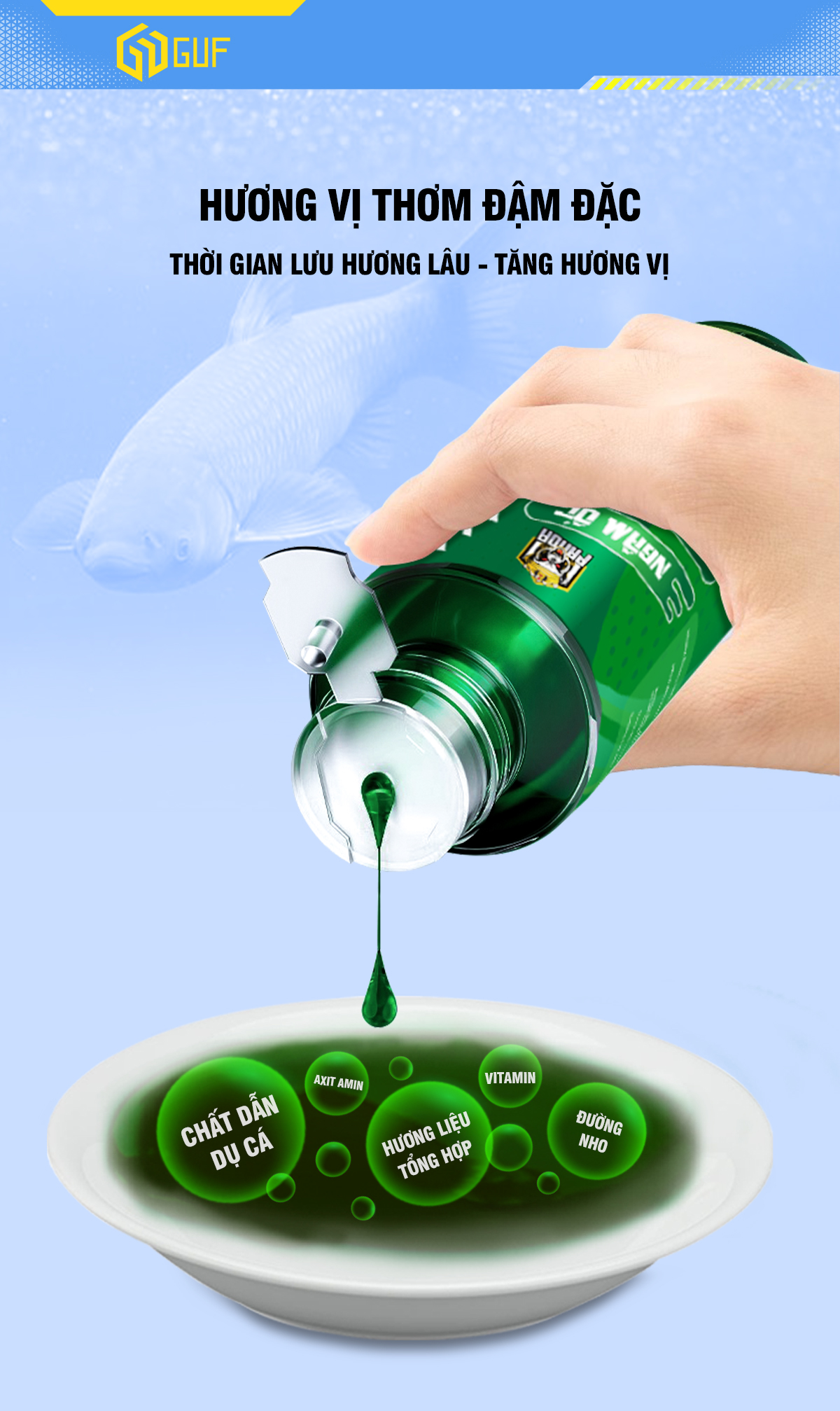 Đặc biệt: Được sản xuất với công thức đặc biệt từ đường nho, hương liệu tổng hợp, chất dẫn dụ với độ đậm đặc cao giúp mùi thơm lan tỏa mạnh mẽ, giữ hương vị lâu, thu hút cá vào ổ nhanh, kích thích cá ăn mồi.