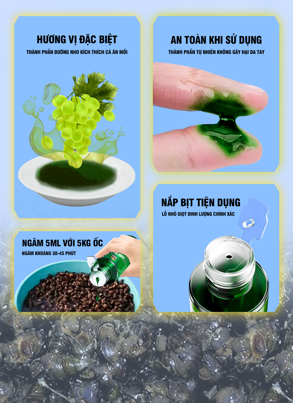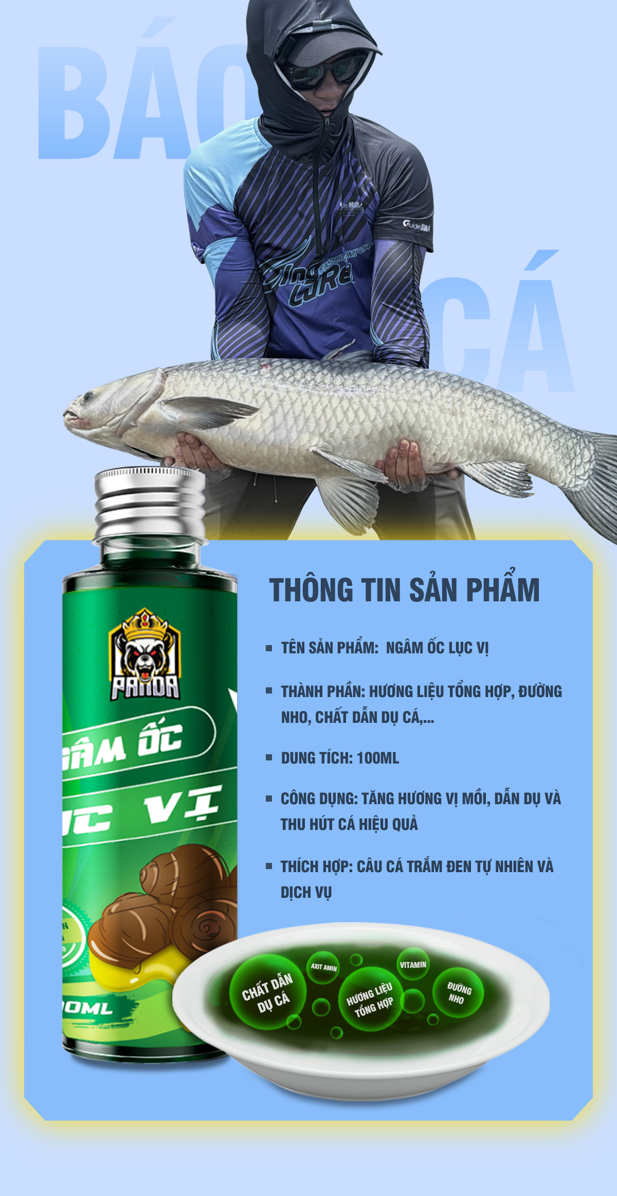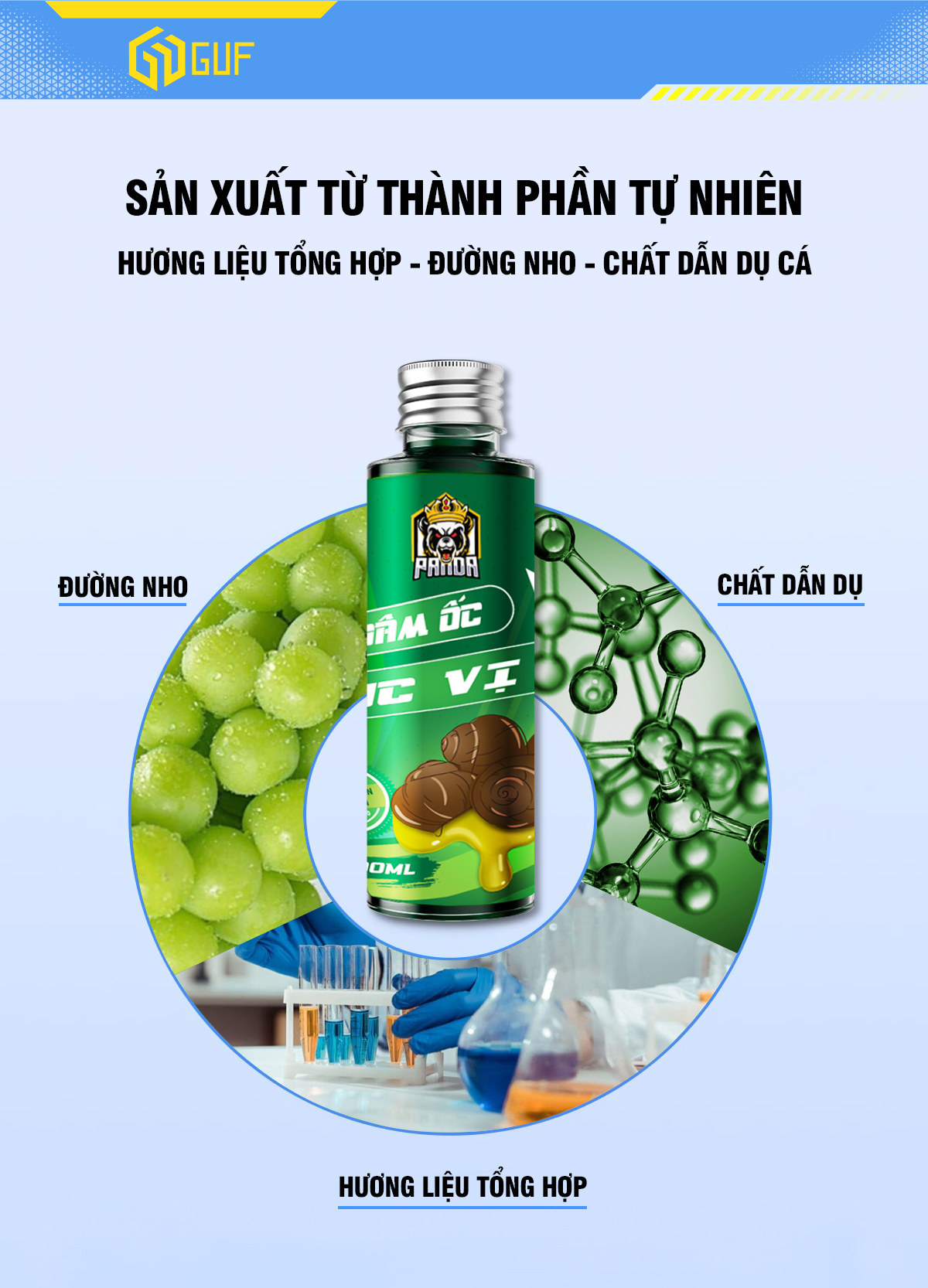 Đặc biệt: Được sản xuất với công thức đặc biệt từ đường nho, hương liệu tổng hợp, chất dẫn dụ với độ đậm đặc cao giúp mùi thơm lan tỏa mạnh mẽ, giữ hương vị lâu, thu hút cá vào ổ nhanh, kích thích cá ăn mồi.