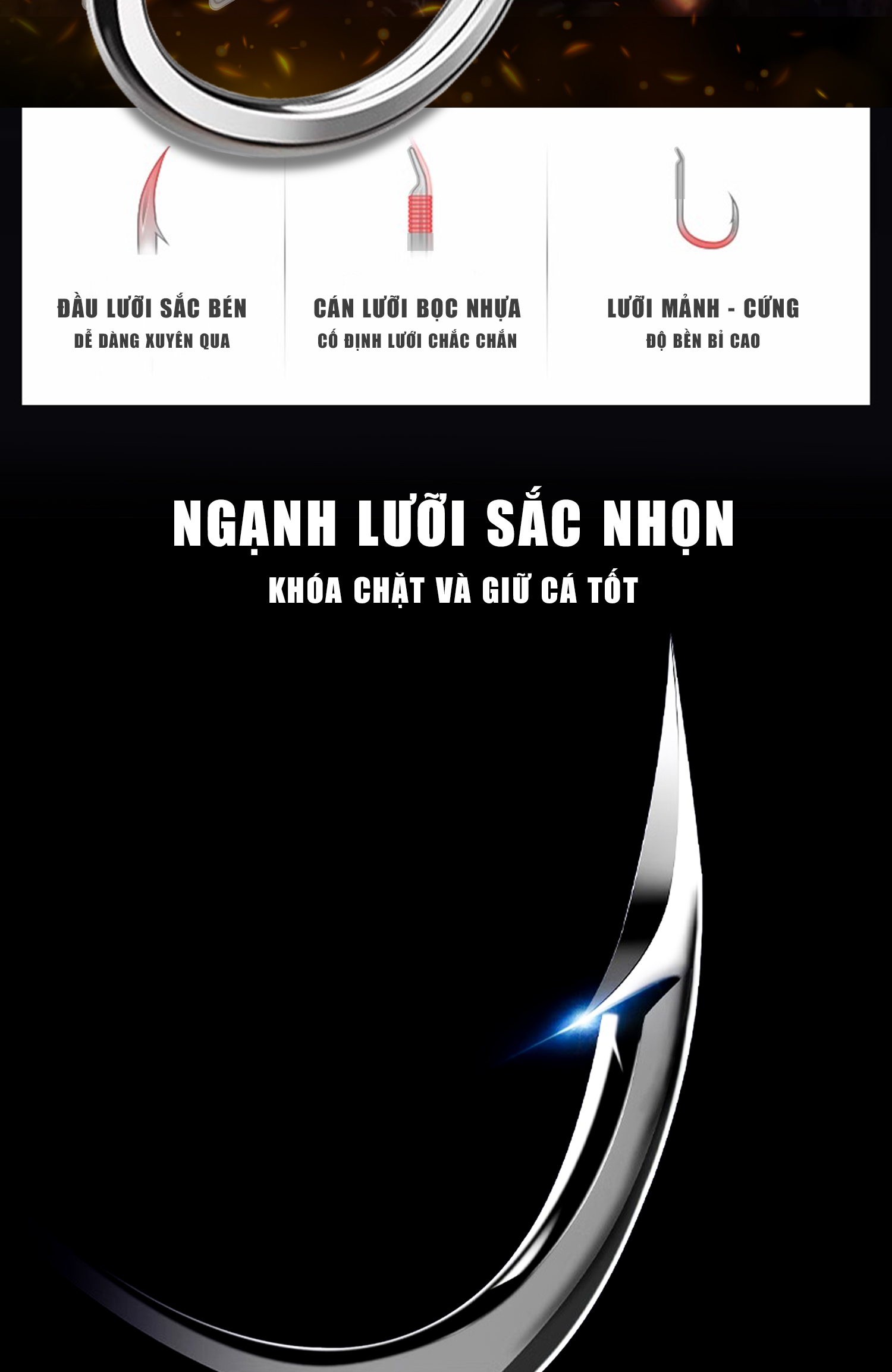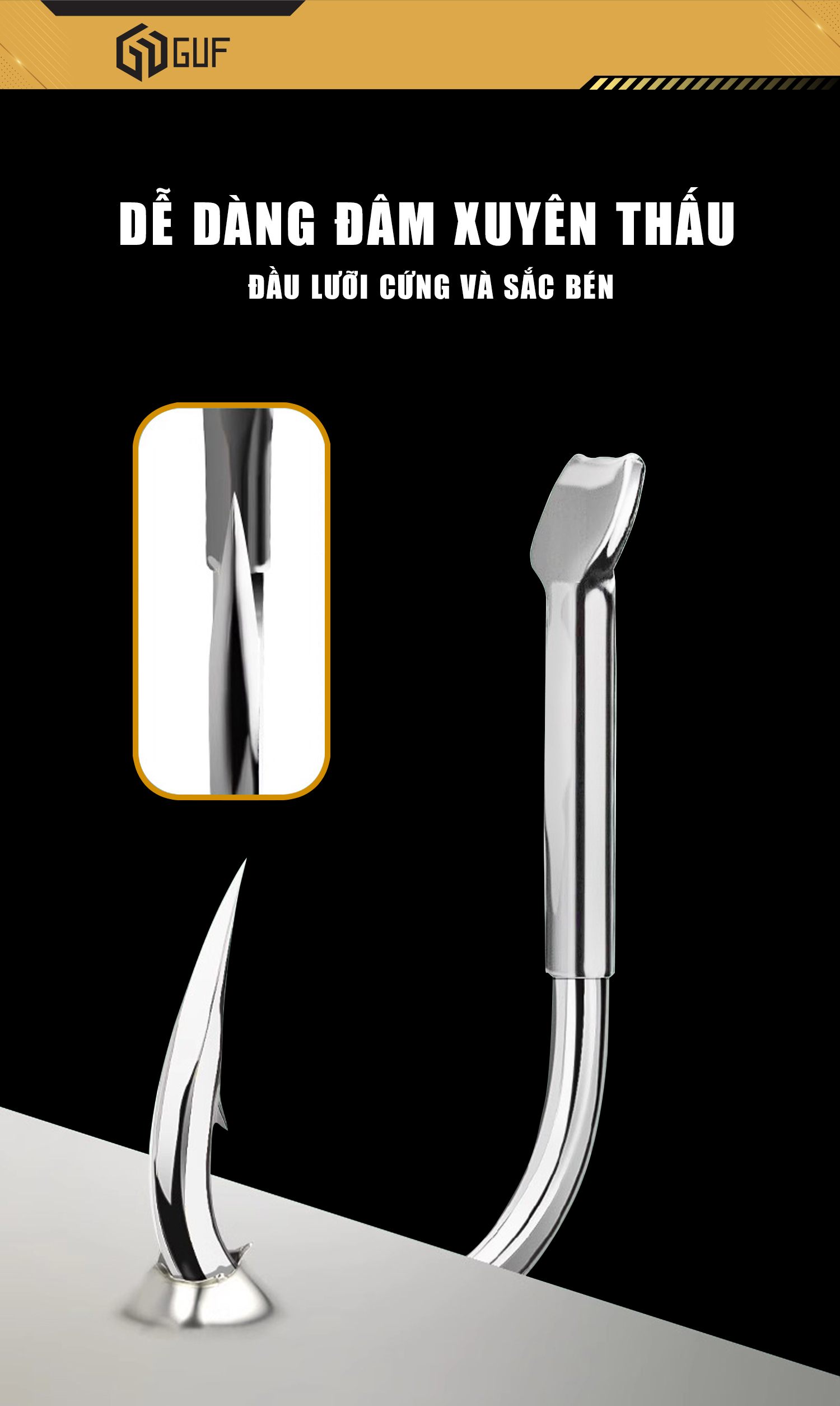 Đặc biệt: Được làm từ thép cao cấp, cứng, nhẹ, lưỡi sắc bén, được làm phẳng giúp giảm ma sát, dễ dàng đâm xuyên, giữ cá tốt