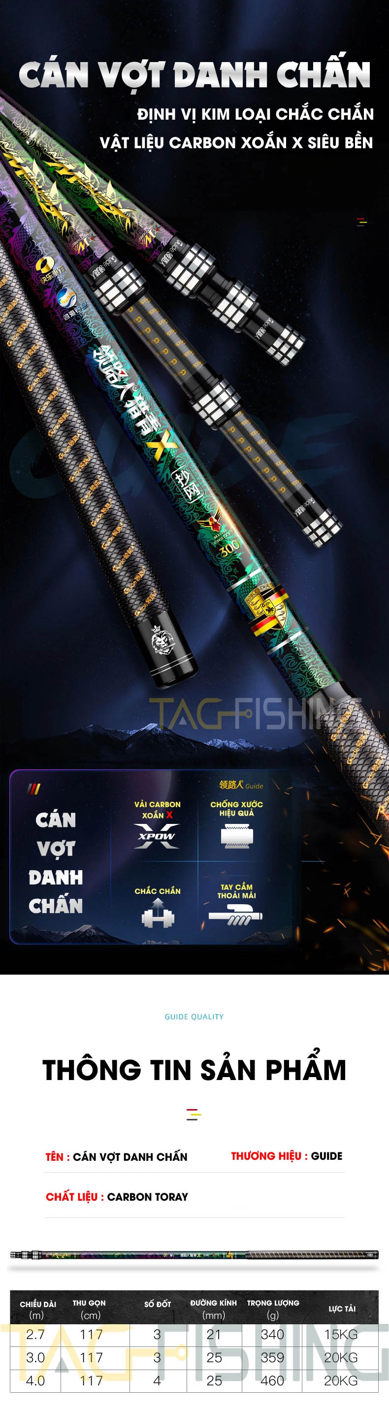 Sở hữu khả năng săn hàng SIÊU KHỦNG BỐ nhờ sản xuất bằng vật liệu carbon Toray thượng hạng, công nghệ in 3D mạ điện giúp màu sắc và họa tiết trên cần cực kì sắc nét và đẹp, trọng lượng nhẹ hơn nhiều so với các cần săn hàng khác, Cần Guide Danh chấn thiên hạ xứng đáng là một ứng cử viên sáng giá cho ngôi vị “quán quân săn hàng”.
