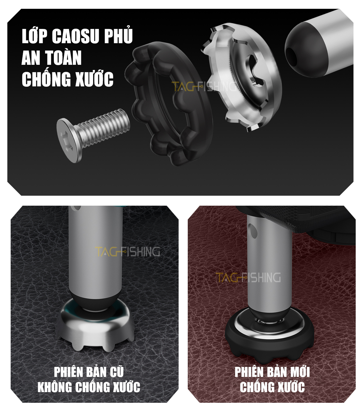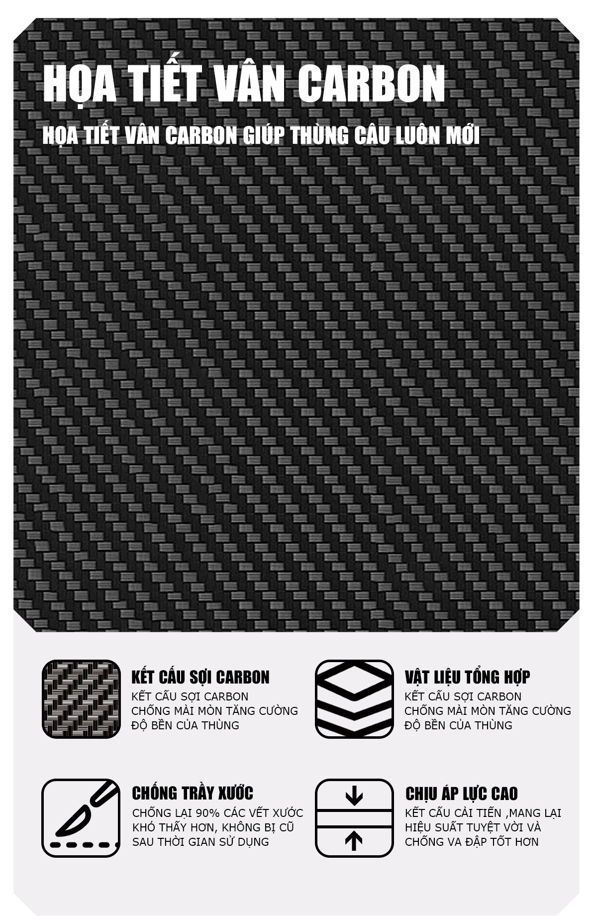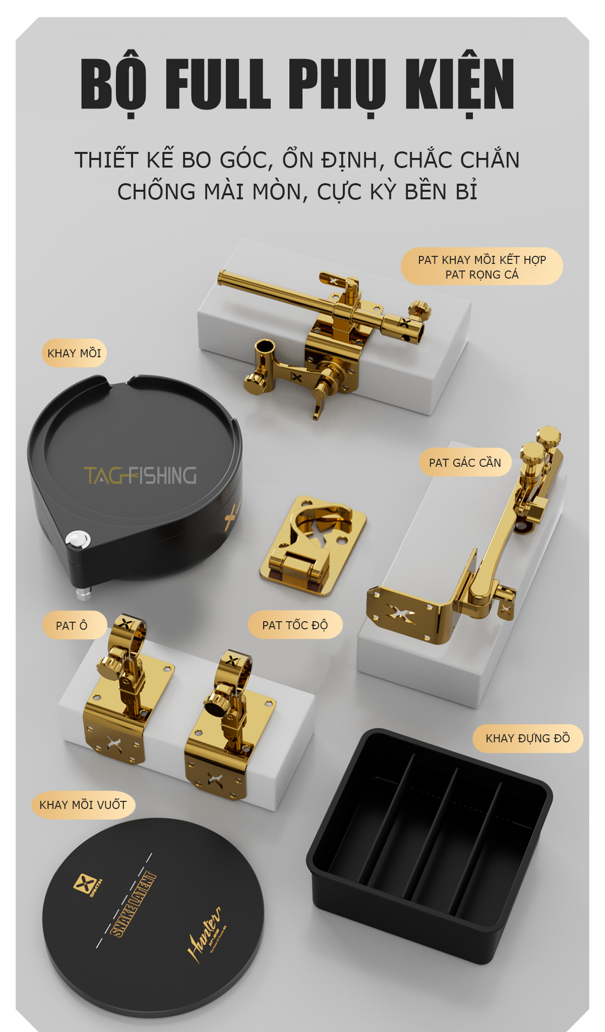 | Phụ kiện đi kèm | Pat khay mồi kết hợp pat rọng cá, pat gác cần, pat ô, pat gác cần tốc độ, khay mồi, bàn vuốt và khay đựng đồ, Dây đeo vai, đệm chân cao su, hộp đựng phụ kiện |