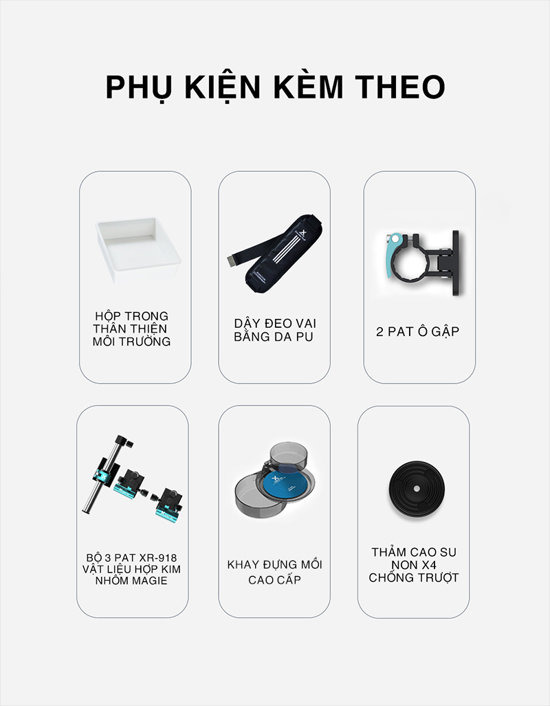 | Phụ kiện đi kèm | Dây đeo, đệm chân, khay mồi, hộp đựng đồ, bộ 3 phụ kiện, PAT Ô gập |