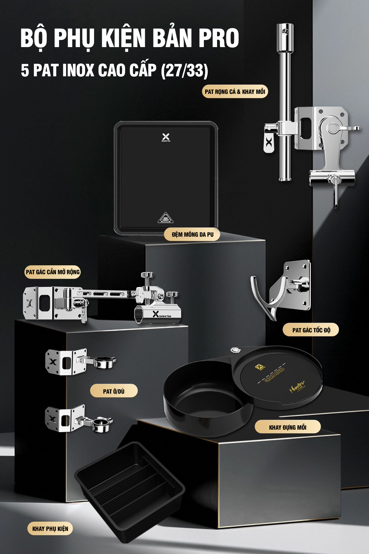 | Phụ kiện đi kèm | Đệm mông da PU, Bộ 6 pat inox cao cấp, Dây đeo vai, đệm chân cao su, hộp đựng phụ kiện, khay mồi |
